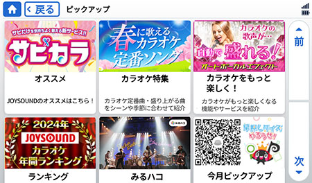 JOYSOUND X1でお楽しみいただける「みるハコ・RecTV for JOYSOUND・X PARKプレイ」の各サービスヘ簡単にアクセス。「ピックアップ」は、キャンペーンやおすすめコンテンツ等が表示され、カラオケの楽しみ方が広がります。